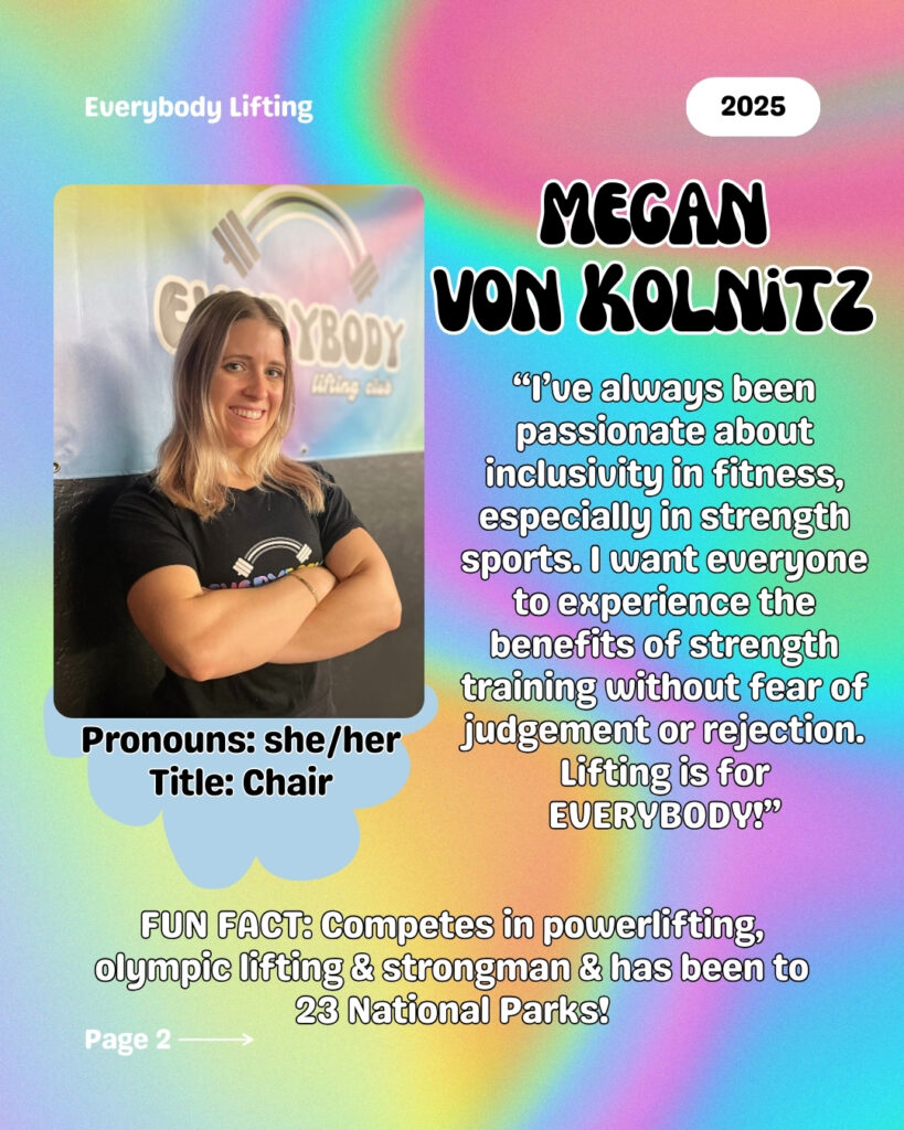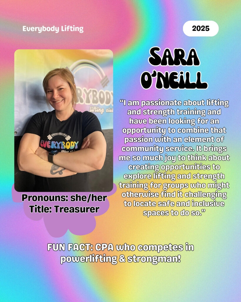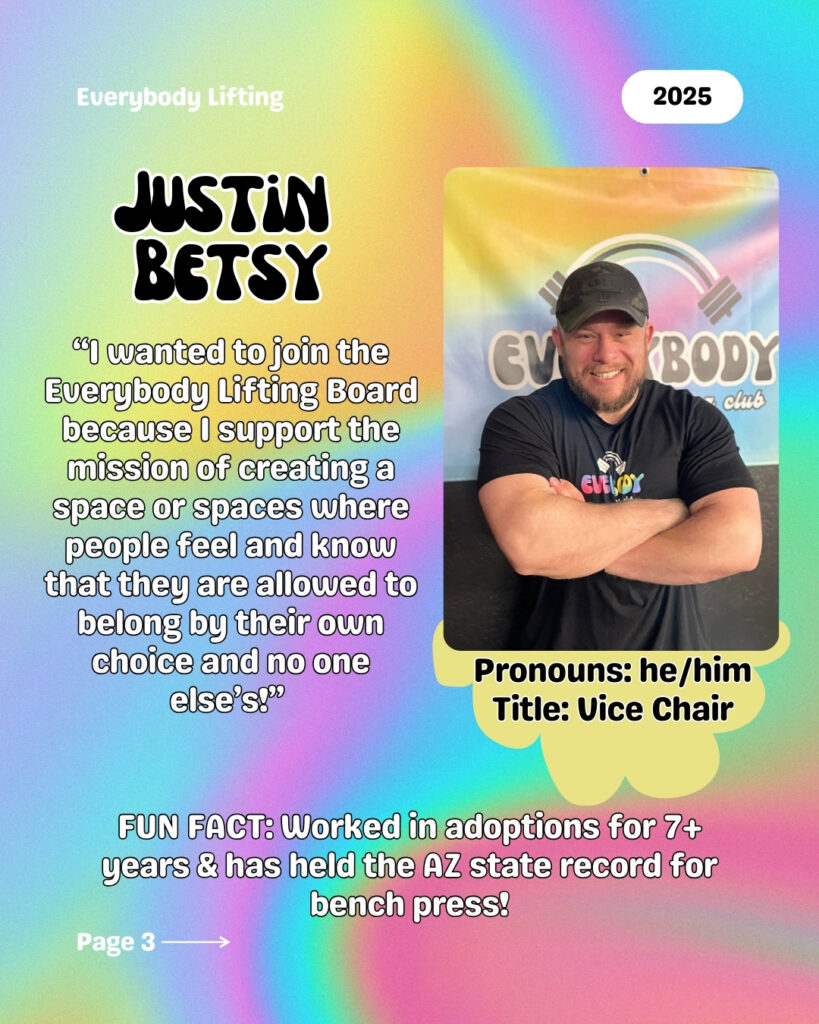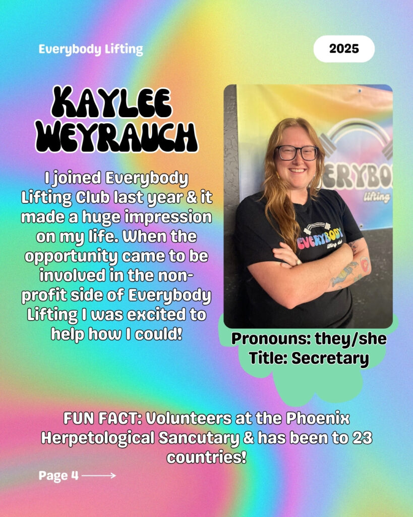 Everybody Lifting is a non-profit based in Phoenix, Arizona. Founded in 2024, the organizationโs mission is to provide an inclusive, supportive, and equitable space where everyoneโincluding LGBTQIA+ individuals, people of diverse body sizes, and those with disabilitiesโcan train, compete, connect, and thrive.